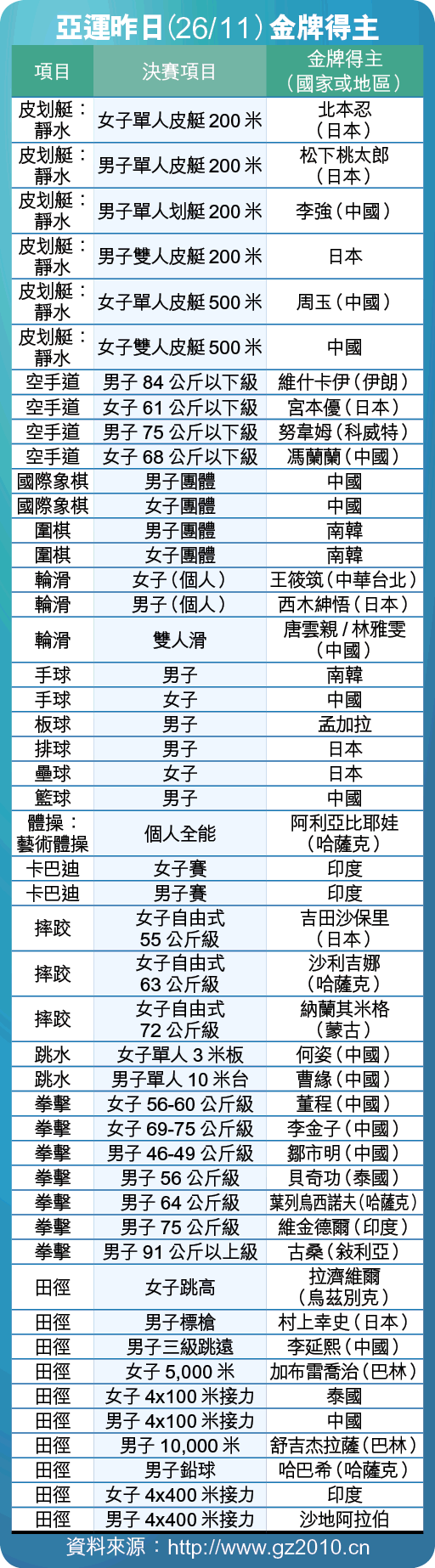 中國周五再進賬16面金牌後,奪金數目達197面,已經遠超1990北京亞運會的183面金牌的歷來最佳紀錄。