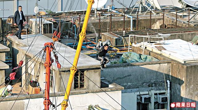 昨日拍攝戇J與一外籍男演員在天台追逐場面,男演員要由重慶大廈天台跳過相距數米的另一大廈天台,拍攝前男演員先做拉筋等熱身動作,然後工作人員為他綁上威吔後便開始拍攝。身為特務的戇J,與該男演員在天台追逐,但一向「符碌」的戇J追到氣咳也追不到對方,最後還被對方一躍跳過對面大廈成功甩身,頓令戇J束手無策。