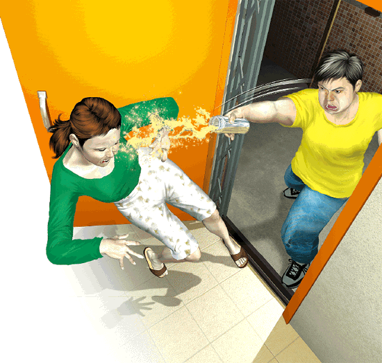 昨日上午約11時45分,蔣婦與姓吳中年女親友在家中聽到鐵閘傳來異聲,於是開木門及鐵閘查看。門外一名肥胖男子一見她出現便大叫「死八婆」,隨即將手上一樽鏹水迎面向她潑去。