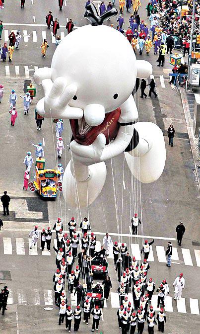 「功夫熊貓」、「孱仔」(WimpyKid)、「巴斯光年」、「吉蒂貓」前天(周四)空群而出,參加美國紐約第84屆感恩節巡遊,成千上萬人夾道圍觀,一個又一個的巨型卡通人物氣球令小朋友不時興奮尖叫,氣氛熱鬧。美聯社