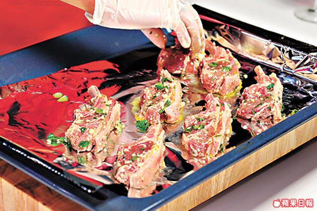 2.將醃好的羊扒放上已鋪上錫紙的焗盤上,預熱焗爐至300℃,焗約6分鐘至金黃,取出反轉,繼續焗多約6分鐘即可上碟。
