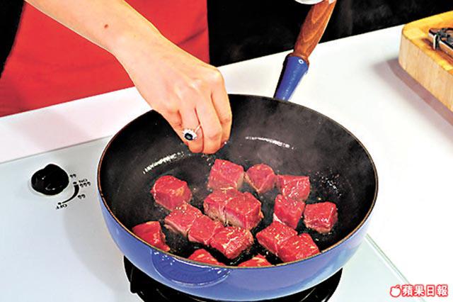 3.開大火燒熱鑊,放入牛脂肪,煎出油份後取走,然後下半份牛油煮溶,放入牛柳粒,撒入黑胡椒碎、鹽,煎約4分鐘至半生熟,或按個人喜好的生熟程度,盛起上碟。