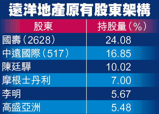 遠洋地產於07年上市,公司在09年底曾發新股予中國人壽,引入成為股東,今年初國壽再收購中化集團於遠洋地產的持股,使其總權益升至24.08%,成為遠地的單一最大股東。