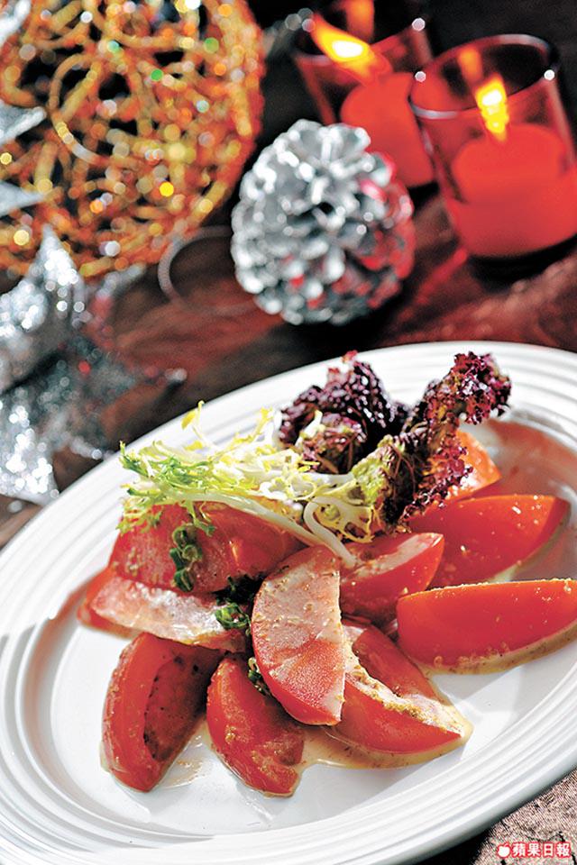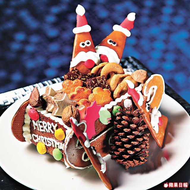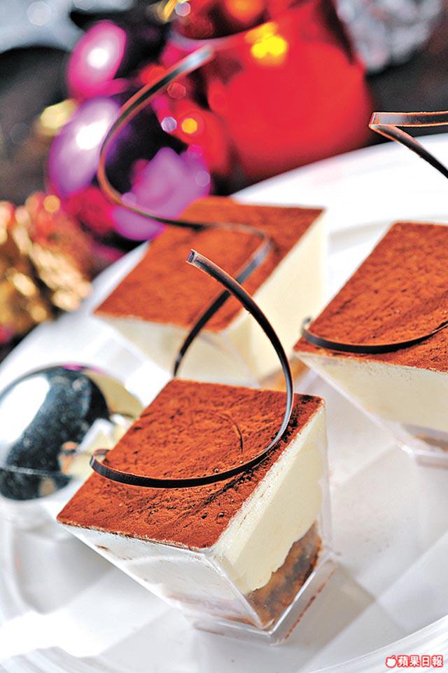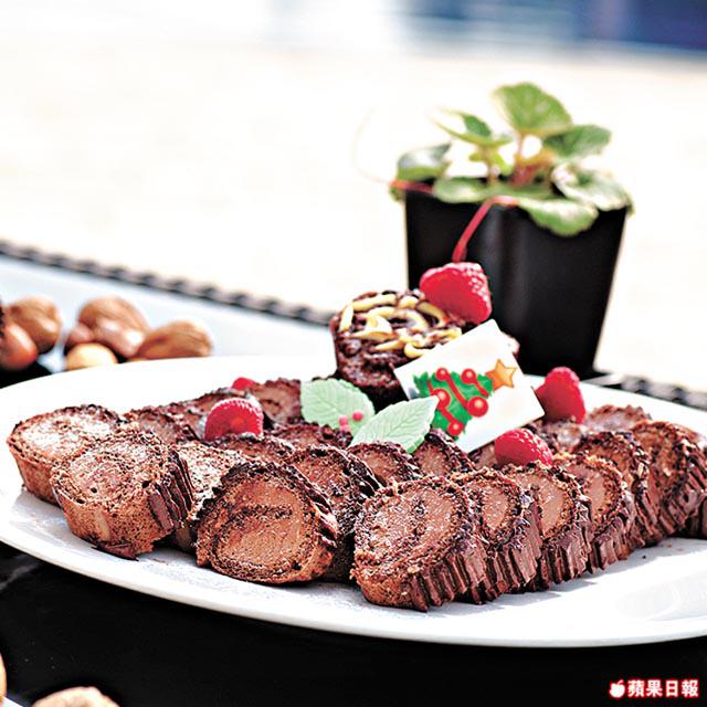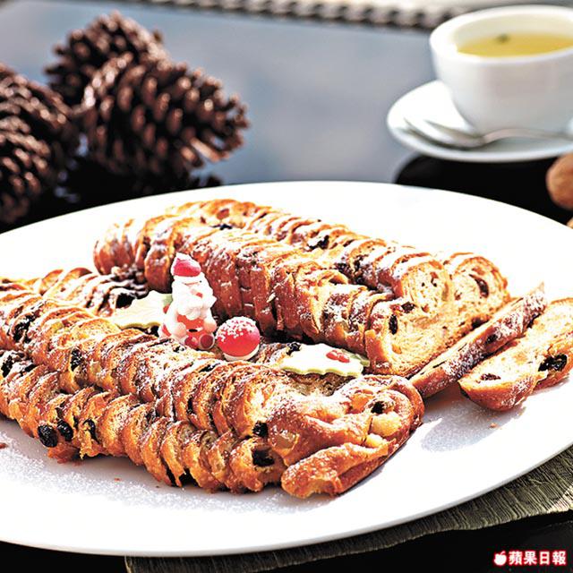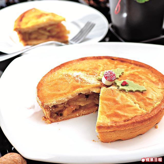 吃得七七八八,肚子剩下的空位當然用來放甜品,聖誕節那幾天,酒店預備了傳統的樹頭蛋糕、曲奇和果子麪包。樹頭蛋糕有濃厚朱古力味,聖誕果子麪包內的提子乾和雜果皮,則事先浸冧酒一個月,索夠酒味。吃甜品,當然少不了著名的沙田蘋果批,普通的蘋果批用青蘋果加砂糖,這裏則用沙田萬佛寺旁蜜蜂場提供的蜜糖代替砂糖,為增加甜味,除青蘋果外還加入紅蘋果,蘋果粒放入真空袋用蜜糖浸兩日,加冧酒、提子和肉桂等做餡,比一般蘋果批更香口。