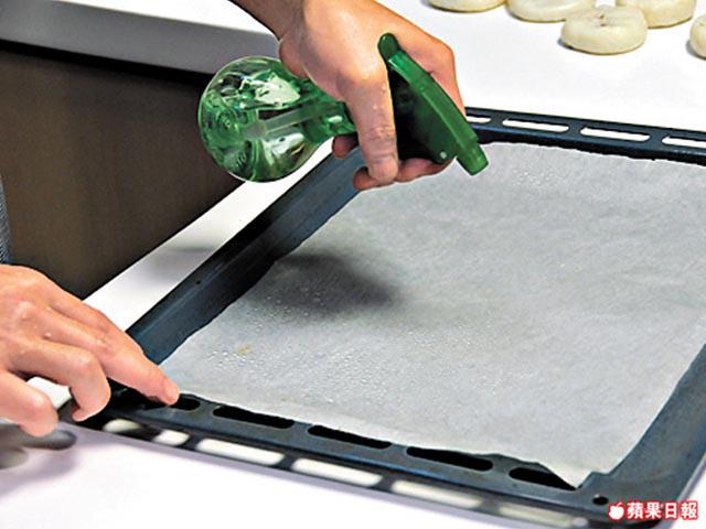焗燒餅時,先在焗盤上噴水再撒白芝麻,可使燒餅容易黏上白芝麻,且受熱較平均。