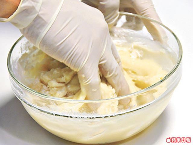 1.將糖加滾水攪溶,再下生油、香蕉油拌勻後,逐少加入糕粉攪至完全混合至稠身的糊狀,待1分鐘。