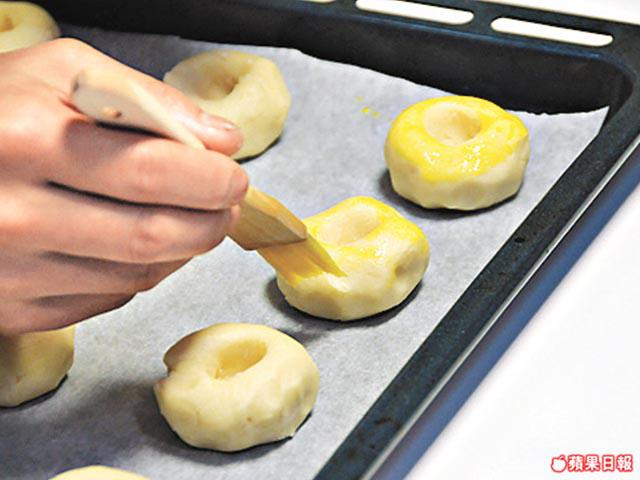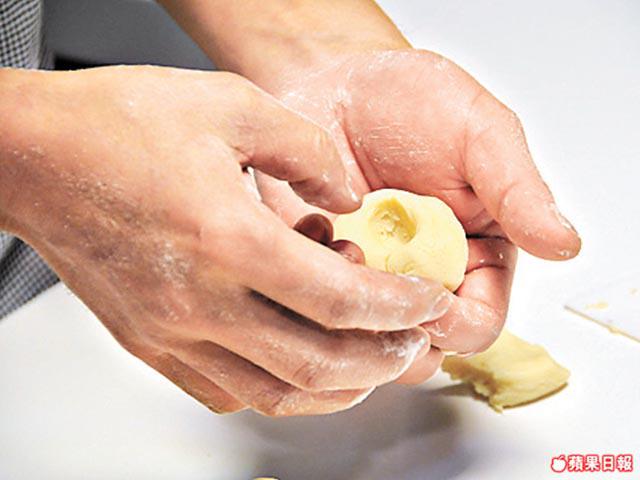 在麪糰中央輕力壓一小孔,待會兒焗起來就更易定型。