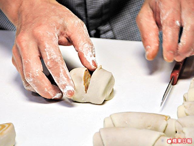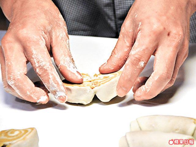 6.枱上撒上手粉,將包有餡料的麪糰搓長條,碾開,再捲起,在麪糰上用刀切入約2/3,攤開平放,略按平成鮑魚狀。