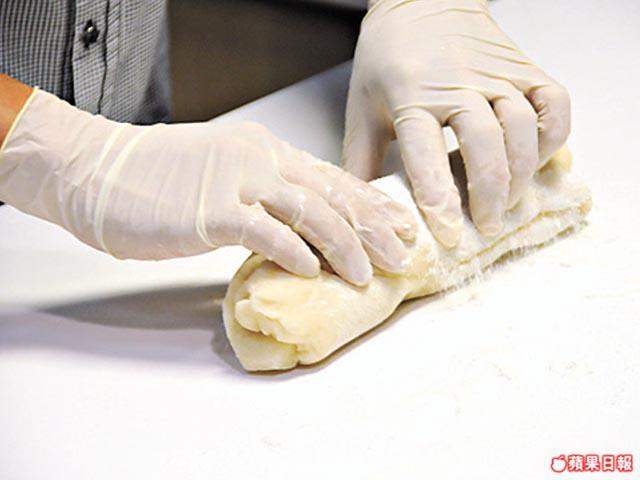 4.將水皮略按扁,釀入油酥,沿邊收緊口後碾平,捲起按扁,再摺三摺成酥皮。