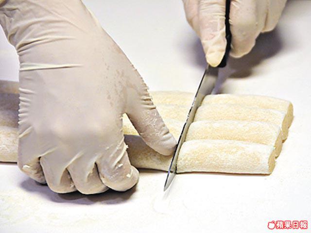 2.手粉撒上枱,將香蕉糕切開,再搓成長條狀。
