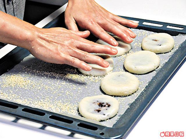 4.在鋪上牛油紙的焗盤上噴少許水、撒上白芝麻,然後放上燒餅略按平。