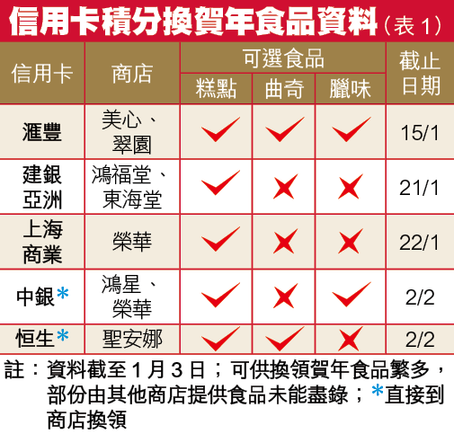 現時有5家銀行設積分換賀年食品優惠,可選擇商戶共8家,恒生只可選擇聖安娜,其餘銀行均有兩家商戶選擇。滙豐提供食品種類最多(表1),包括糕點、曲奇、臘味及醬油。上商除糕點外,還有海味,如鮑魚、元貝及花菇等,但糕點只限以積分換領。換領方法分全以積分換領,及積分加現金,中銀僅可以積分加現金換購。