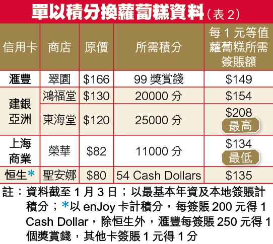 假設換領賀年蘿蔔糕,撇除食品質素、牌子及口味,以原價及所需積分比較,每個蘿蔔糕約需1.1萬至2.5萬分。用建銀亞洲信用卡積分換東海堂食品,積分要求最多,2.5萬分才可換原價120元蘿蔔糕,換言之,每1元等值的蘿蔔糕要簽賬208元才換到,較上海商業銀行只需134元,多74元或55%(表2)。