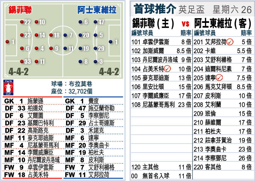 英冠錫菲聯周六英足盃第3圈越級挑戰英超的阿士東維拉,以後者近況之差,客場隨時陰溝裏翻船,故[+1]捧「主勝」。(球賽編號:星期六26;now671台今日11:00pm直播)