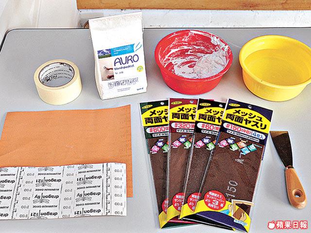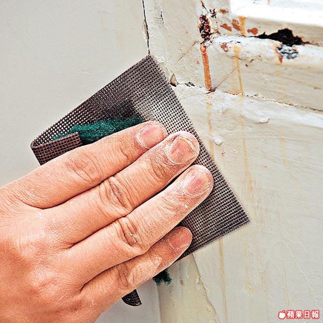 用力把灰料壓在小洞和裂縫上,落鏟宜一下過,會較為平滑。灰水乾透後,用粗砂紙磨滑表面,然後再用幼砂紙打磨。