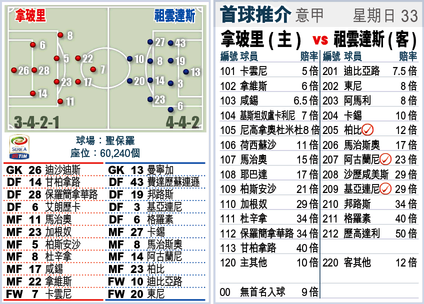 鋒將買少見少,祖記忽然從熱拿亞找來東尼救亡。祖記唯一可喜是去仗停賽的國腳中堅邦路斯停賽後復出,由他夥拍基亞連尼予人一定信心。至於曼寧加多年來慣性隨傳隨到,其把關能力尚算有一定保證。有別於上次主場搶攻,祖記今訪那不勒斯應先做好防務,若保持今季作客僅一敗(開鑼戰負巴里)的水準,加上迪比亞路、格羅素等老兵,對拿玻里未必冇得打。
