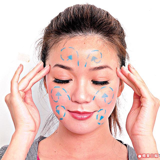 留意Model臉上譜號,每個符號都是重要穴位,只要在塗乳霜或精華素時,以食指指尖輕輕按壓逗點位三次,如此重點按摩,就可透過血液循環令面色更紅潤,同時亦可增加對護膚品的吸收。