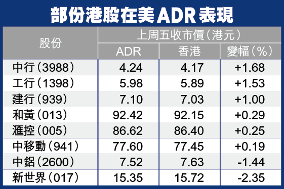 本港藍籌股的美國預託證券(ADR)上周五大多向好,重磅的滙控(005)及中移動(941)靠穩,分別較港收市高0.22元及0.15元。