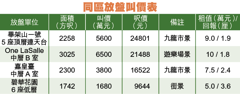 地勢較高的廣播道,有1組單幢樓名嘉皇臺,樓齡約9年,設2300方呎四房單位,現時1個中層放盤,叫價3800萬元,呎價16522元。去年12月,低層連面積逾6600方呎巨型平台的特色單位,面積2390方呎,以4250萬元易手,呎價17782元。