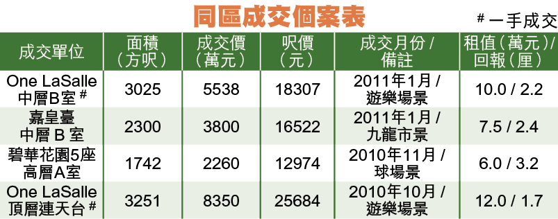 OneLaSalle入伙至今,尚未錄得二手轉售,成交集中一手,今年1月中層B室,3025方呎,成交呎價18307元,去年10月頂層連天台特色戶,以呎價25684元售出,造價與介紹連平台叫價貼近。