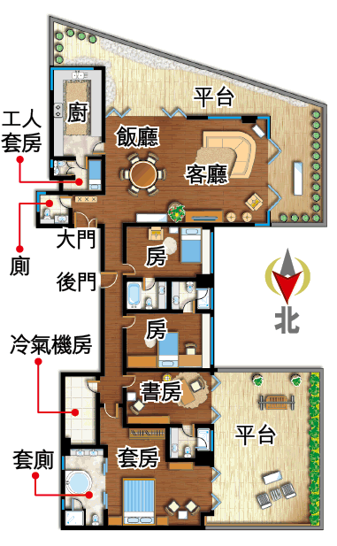 間隔:4套房2廳;另工人套房