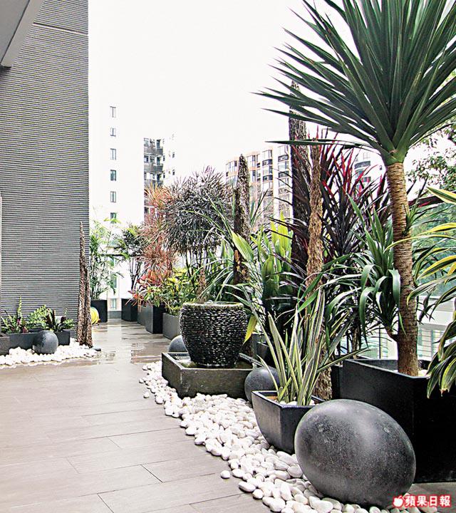 特色戶二手放盤只得1個,為低層連平台單位,業主落本佈置,室內添置家具及電器,宛若示範單位模樣,戶外兩組平台都新鋪地磚,客廳對出以白色碎石圍邊,陳設各式高高低低的盆栽,加淙淙水景作伴,打造城市綠洲。另主人套房對出平台,側旁鋪砌戶外木牆,其餘就擺放鞦韆及桌椅,營造悠閒氣氛。