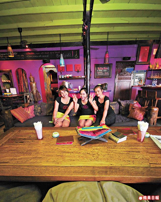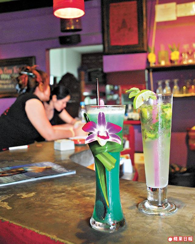 上回介紹過海邊舖滿白色大床,好玩唔好食的NikkiBeach,今回被街角彩色繽紛的小店吸引坐下,細望,每一圍對坐,都是給磨得光滑的古董木架床,有刻花的、矮腳的、擺滿豆袋的,然後小露台裏的小木架床,或老桌椅前羅帳輕掛,劃出一個個自我空間,配上艷紫撞嫩綠,溝埋姣婆藍同桃紅的牆壁與床帳,加上淡紅昏暗的燈光,氣氛綺麗得來有點奇詭。泰國真假古董市集都多,但那點點歷史刮痕,及現世代找不着的設計,總勾起你腦裏的幾個古董神話。循例都要影吓這裏最正特飲,幾個侍應姐姐笑笑推推,推介SexOnTheBeach。又係?有無啲新意呀?問極都話呢杯好。飲啖,唔辣嘅?不夠hot喎!倒是調得清清甜甜的,大熱天時係幾開胃,反而更易唔覺唔覺喝醉的那種……