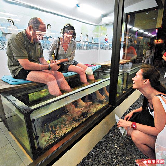 夜市除了食和買,還有魚仔spa!地踎小店落地玻璃一排的魚缸讓客人坐着浸腳,腳皮多的人還會成為旅遊景點,好多人合照o架!Sukmi就忍不住踎低「欣賞」一個遊客雙腳由魚仔群摟成一對今年大熱的魚毛boots!每位約$50