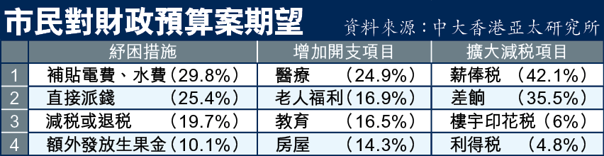 中文大學香港亞太研究所上月底訪問812名市民,調查他們對財政預算案的期望,發現在增加政府開支方面,近兩成半受訪者支持增加醫療開支,增加老人福利及教育開支的受訪者各佔一成六;減稅訴求方面,四成二期望減薪俸稅,三成五減差餉,三成三提高個人免稅額、兩成三增加供養父母免稅額。