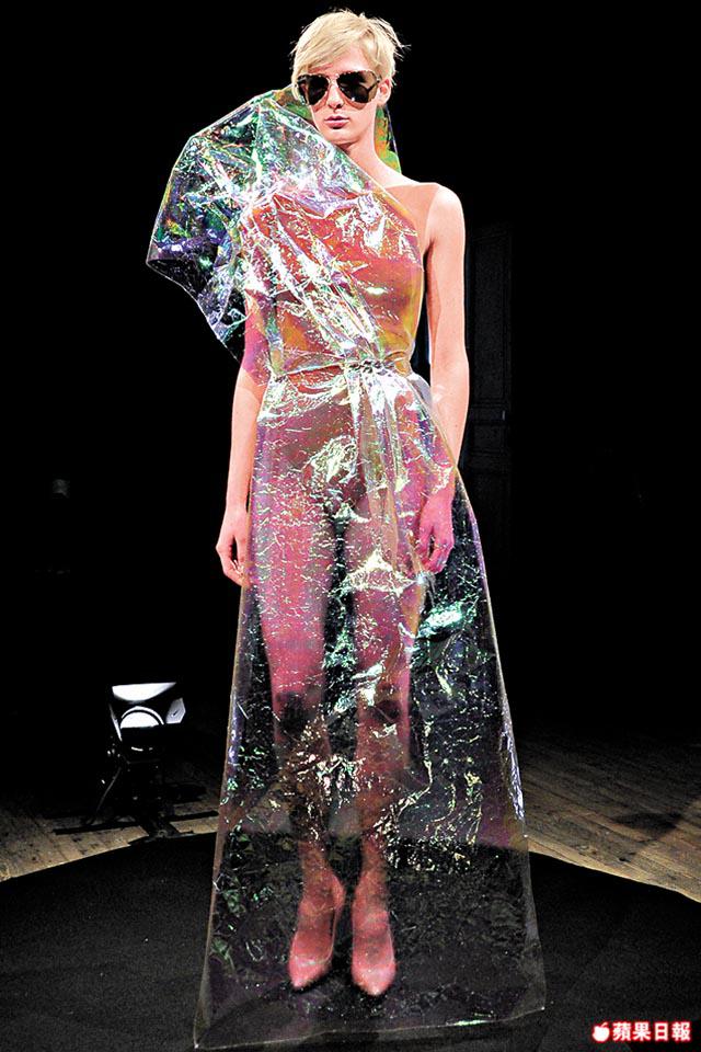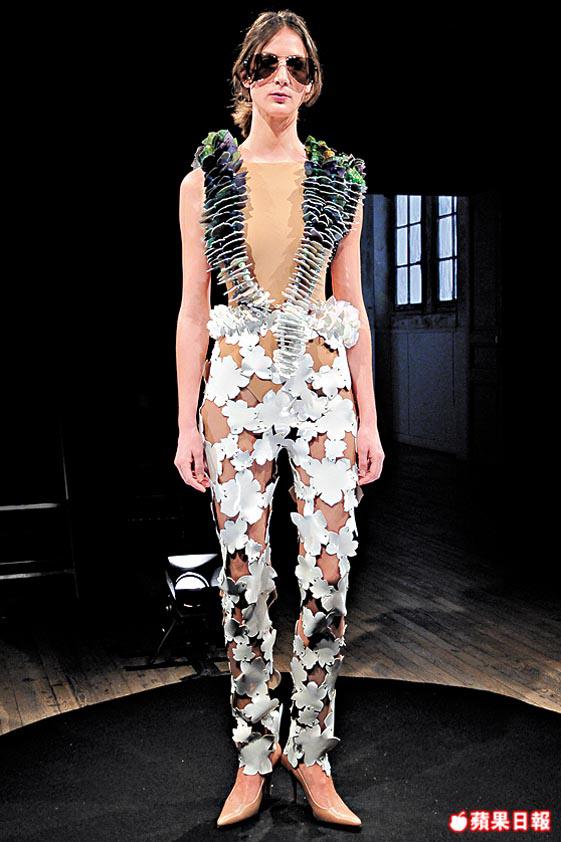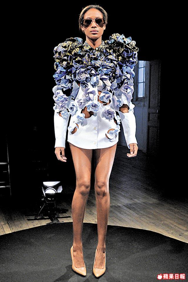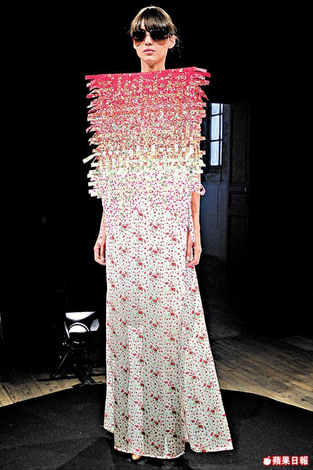 10套花形衣衫,不少延續10月ready-to-wear的2D平面主題輪廓,包括有以lycra、棉布、羽毛構成的wovencocktaildress、以polyester、taffeta、lycra構成的絲帶花瓣catsuit、以polyester及stretchsatin構成的flowerfurcollar、腰果花圖案圍巾cablesweater、paper-drapeddress、libertyflower-shirt或wovendress等。一如以往,看似粗製手作,但已足夠本地歌手在個唱時作抄襲歌衫之用。
