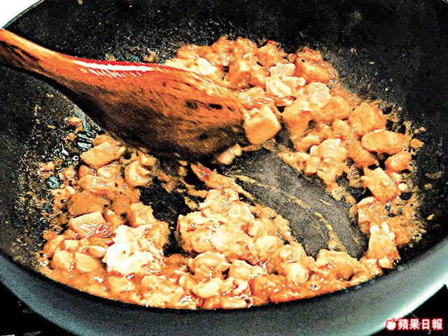 2.開大火,燒熱平底鑊,放入2湯匙生油,爆香薑片及蝦頭,灒酒,加入南瓜粒、蒜茸、雞湯,轉中火煮至南瓜腍軟及湯汁濃稠。然後撈去蝦頭,轉大火,加入調味料及蝦肉粒拌勻成醬汁,備用。