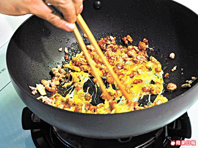 炒米粉時,先落免治豬肉炒散,再加蒜頭、沙茶醬來炒。如果次序掉轉,蒜頭、沙茶醬會很易炒燶;材料炒熟後,最後加入米粉,就會更加入味啦。