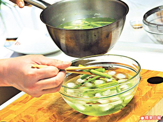 1.蘆笋切去根部,然後切成兩段。開大火,滾水加鹽、蘆笋,將蘆笋灼熟,撈起浸冰水1分鐘,瀝乾盛起。
