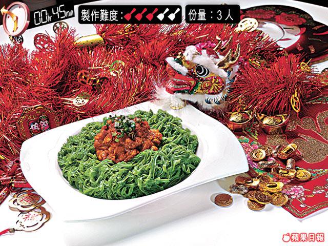 3.開大火,將菠菜麪灼至軟身,撈起瀝乾盛起,淋上醬汁,灑上蝦子及葱花即可。