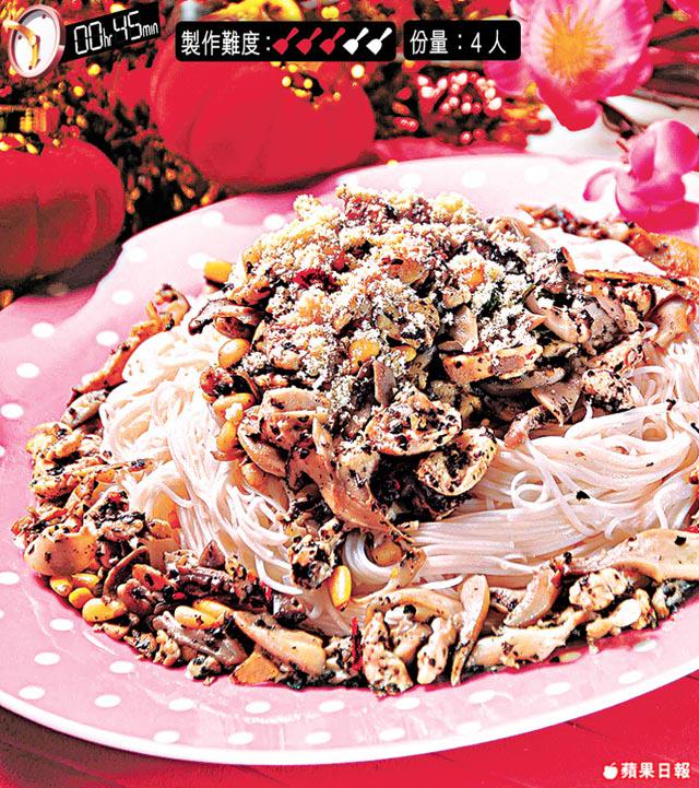 宮麪175克、意大利黑松露醬2湯匙、鮮冬菇、白蘑菇、秀珍菇共80克(同切碎)、蒜頭2粒(磨茸)、雞柳肉4條(切粒)、白酒1湯匙、松子仁1湯匙、九層塔香葉適量、乾辣椒1小隻(切碎)、Parmesan芝士碎適量