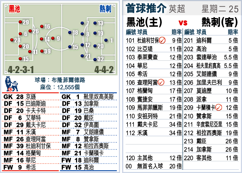 今周中共有兩場英超補賽,周二先上演黑池迎戰歐聯球隊熱刺,前者的「大無畏」精神與踢法,使他們無論失球多少,都會全力爭取入球,故今仗有主場之利下,必熱捧「大」。(球賽編號:星期二25;有線203及301台明日4:00am直播)戰鬥員A