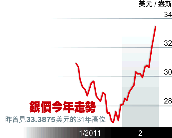 根據瑞銀彭博CMCI商品指數顯示,去年白銀表現是指數內第二佳的商品,升幅僅次於棉花。瑞信分析師格雷伯表示,資金在1月份流出貴金屬市場,價格回落後將吸引投資者重新入市;鑑於白銀較受周期性影響,故短期走勢仍看俏。