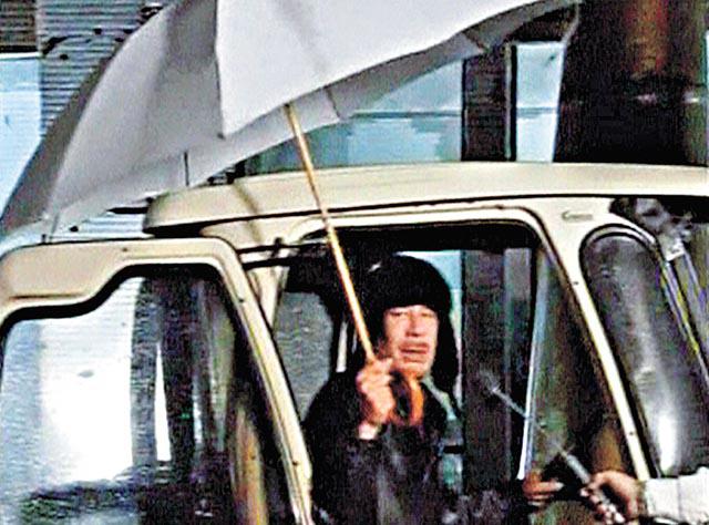 在國營電視台的畫面中,他戴着帽子,坐在客貨車內,打開車門,一手撐起一把大雨傘,身子微微俯身出車外。他這次現身,同樣要證明自己不會出走。「瘋狗」爆粗說:「我想證明我在的黎波里,不是在委內瑞拉。不要相信那些狗管的頻道。」他又話風凉話:「我想跟那些在綠色廣場上抗爭的年輕人講話還有一起守夜,但已經開始下雨了,感謝老天啊,真是太棒了。」