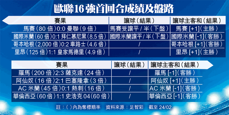 兩支前歐聯冠軍拜仁慕尼黑及曼聯,周三於歐聯16強首回合出師,同取得滿意成績而回:前者復仇成功贏國際米蘭1:0;後者打和馬賽0:0。總結8場16強首回合戰,客隊取得4勝3和1負,即使輸波的巴塞亦有一個作客入球,認真巴閉。青蛙仔