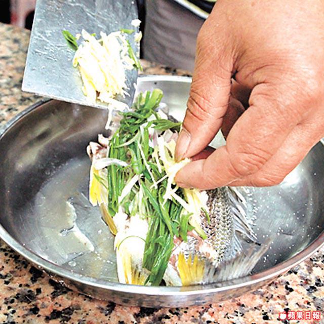3.薑、葱切絲,鋪於鱲魚上。