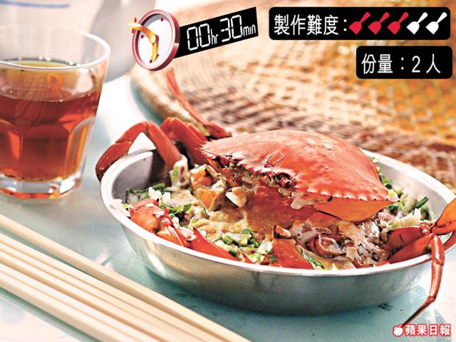 1.蟹斬成數件,除去鰓,蟹膏挖出留用,蟹身與蟹蓋留用。