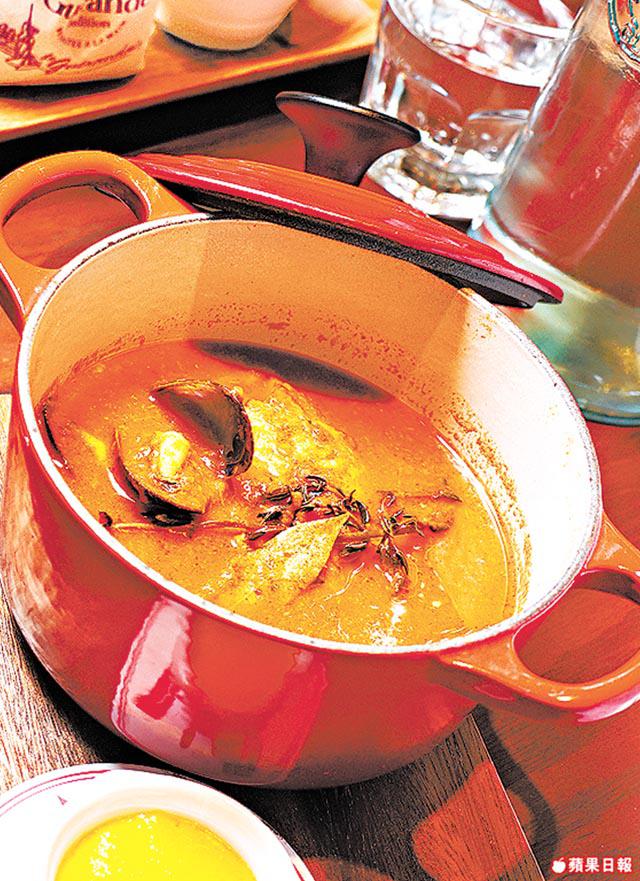時令魚肉燉芹菜及紅蘿蔔五小時,再放青口、魚肉及蟹,可另加蒜香醬汁吊味。