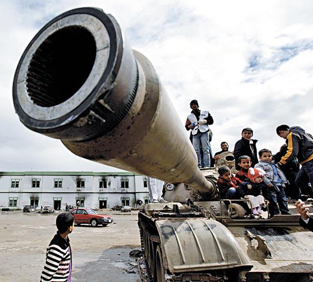 但卡達菲養了一支民兵,強悍精銳,有最精良裝備,兵員中還包括殺人不眨眼的僱傭兵。要跟他們血戰,革命支持者由埃及邊境偷運入武器,又到軍事基地取去大量武器,包括火箭推進的榴彈炮,與民兵對抗。為爭取國際支援,反對派成員舒希比(Tawfikal-Shobhiby)又利用一個受歡迎的足球網站,聯絡和安排外國記者入境,要將卡達菲血腥鎮壓民眾的暴行向全世界曝光。