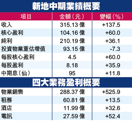 九龍城譽.港灣、牛池灣峻弦及鴨脷洲南灣等大型新盤入賬,推動新地中期盈利急升。新地代理執行董事周國賢稱,未來9個月,在港推售的樓盤包括西九龍瓏璽、元朗尚豪庭及將軍澳56區綜合發展項目的住宅部份,涉及樓面188萬平方呎。