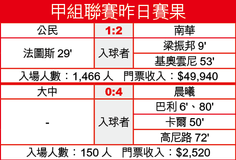 【bma甲組足球聯賽】南華昨午在小西灣運動場上演的甲組聯賽,縱有畢特因傷只做座上客,基士文只踢半場便退下火線,但仍以2:1僅勝公民反壓傑志重上榜首,只是該隊贏波要付出代價,中堅祖爾成為球隊最新「十字軍」成員。