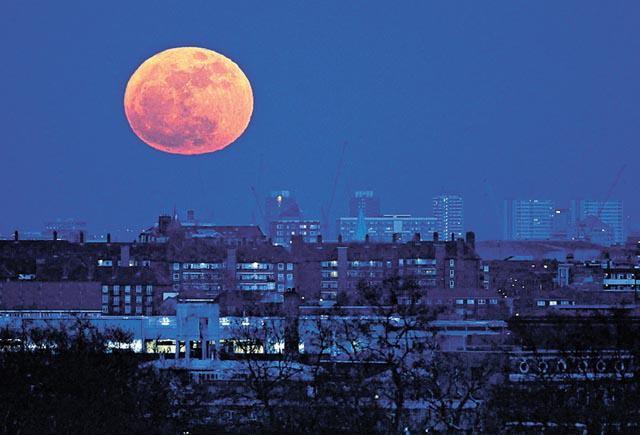 昨晨2時多,地球運行到月亮和太陽之間,月亮正對太陽,將太陽光全部反射給地球,呈現「最圓」狀況;到3時左右,月亮走到距地球最近的位置,離地球約35.6萬公里,比月球地球相距最遠時,要近了5萬多公里,月亮因而比平時大一些,且呈暗紅色,這是由於月亮接近地平面時,波長較短的光波被大氣層折射散掉,波長較長的光波如紅及黃光等就能進入地球。