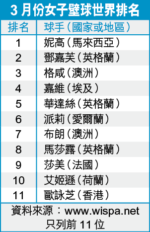 【本報訊】年僅22歲的香港壁球「1姐」歐詠芝,距離世界排名頭10位只差一步(見附表),昨日從大馬返港的她表示,有信心在未來數月可以為香港女子壁球手再寫新的一頁,她說:「本月初首次躋身世界第11位已比我預期為早,亦加強殺入世界頭10位內的信心。」