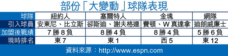 塞爾特人、金塊、網隊、紐約人等球隊均在上月交易限期前進行交易,塞爾特人、金塊在交易後成績較佳,紐約人因戰績不佳發生內訌傳聞。關鍵分別在於綠軍、金塊獲得的均為「綠葉球員」,並非如安東尼般為「超級巨星」,自然較容易融入球隊體系。