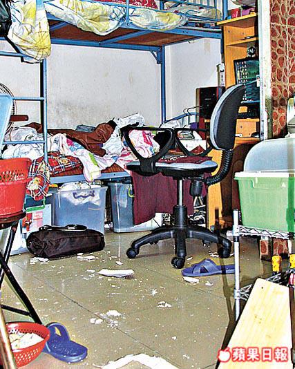 昨午2時30分,男戶主與幼子外出未返,只有女戶主與長子在家。其間,女戶主外出,卻因忘記攜帶物品折返單位房間時,近房門一幅呎半乘一呎的屋頂石屎剝落,露出生銹鋼筋,部份石屎擊中女戶主頭頂,當場受傷流血,女戶主形容頭部被石屎擊中時,「痛到幾乎暈倒」。警員及救護員到場,將女事主送院治理。