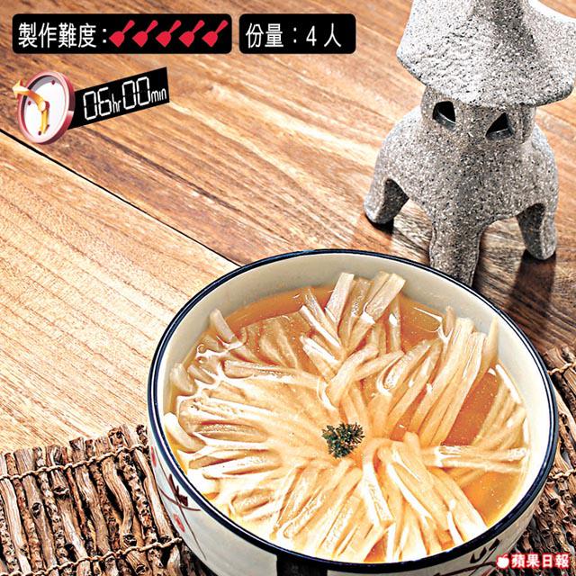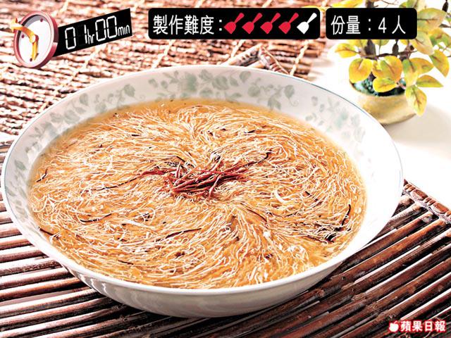 調味料:蒸瑤柱水100克、雞湯1公升、雞粉1茶匙、鹽1/4茶匙、糖少許
